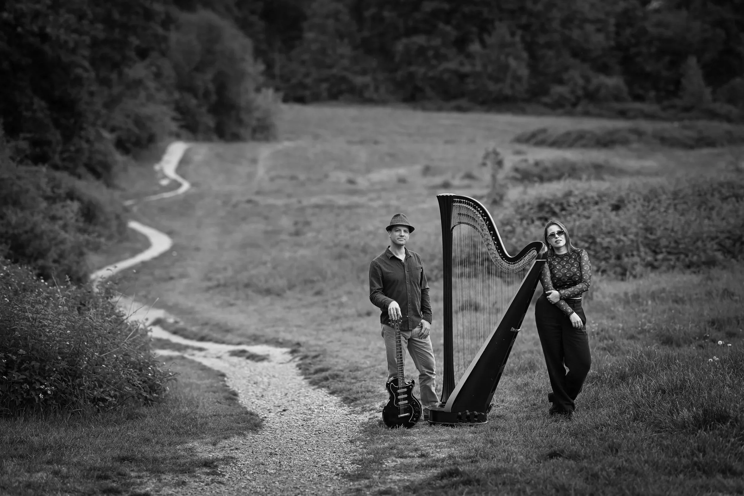 Their original compositions feature harp, electric guitar, bass, synths, live drums, and electronics.