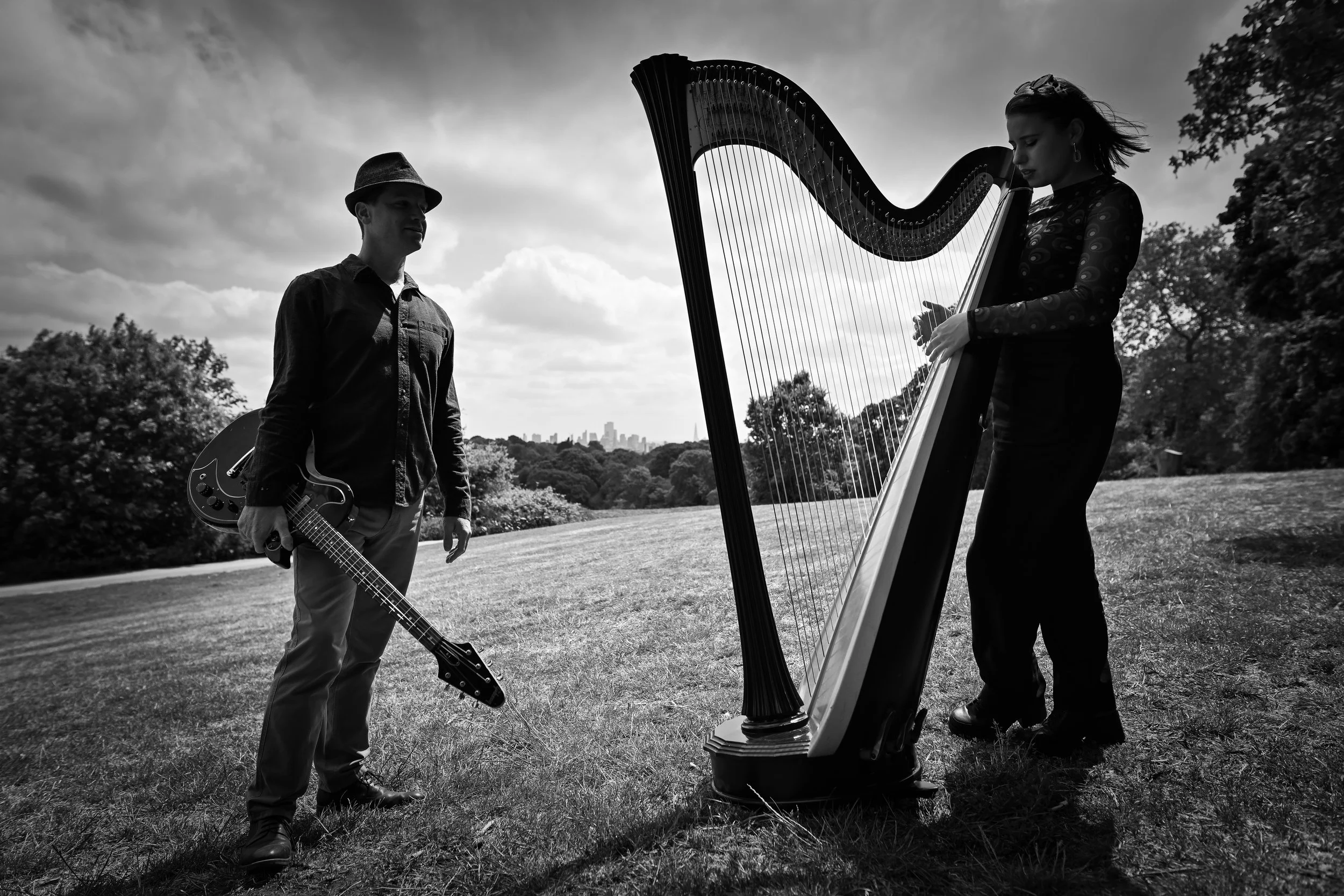 Their original compositions feature harp, electric guitar, bass, synths, live drums, and electronics.